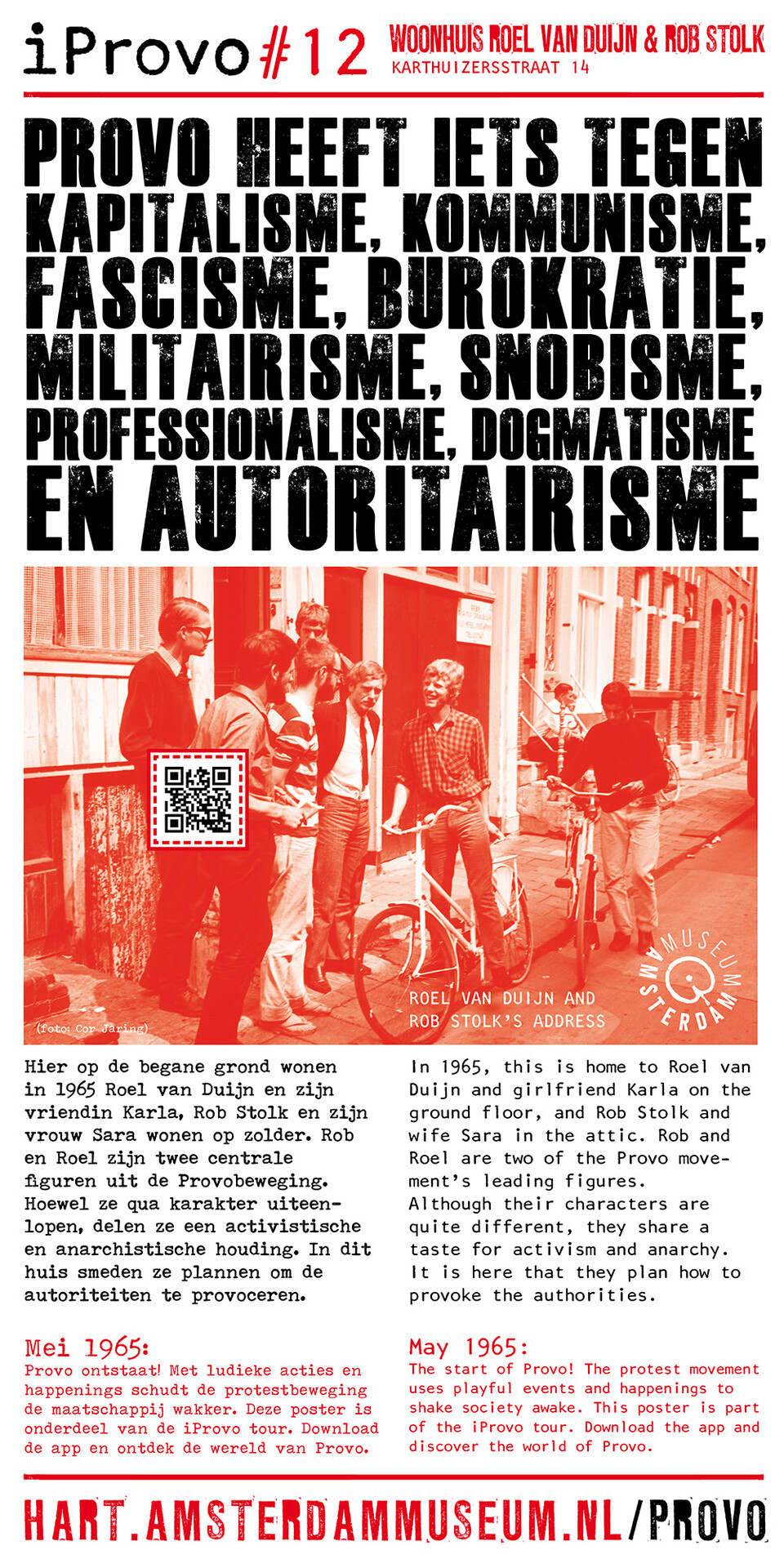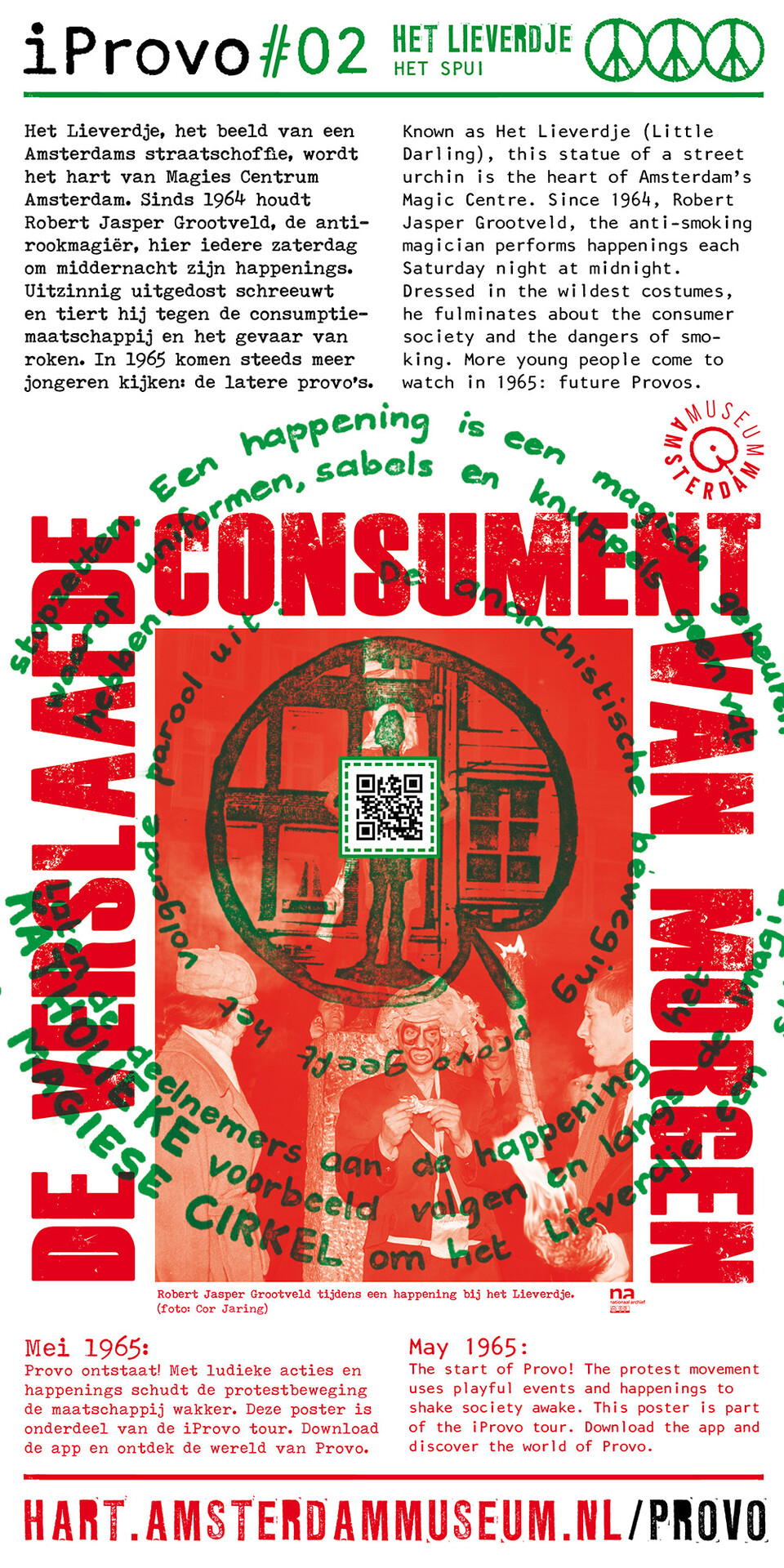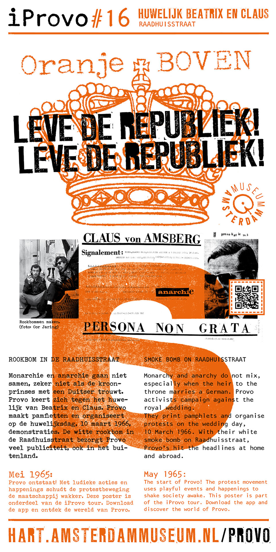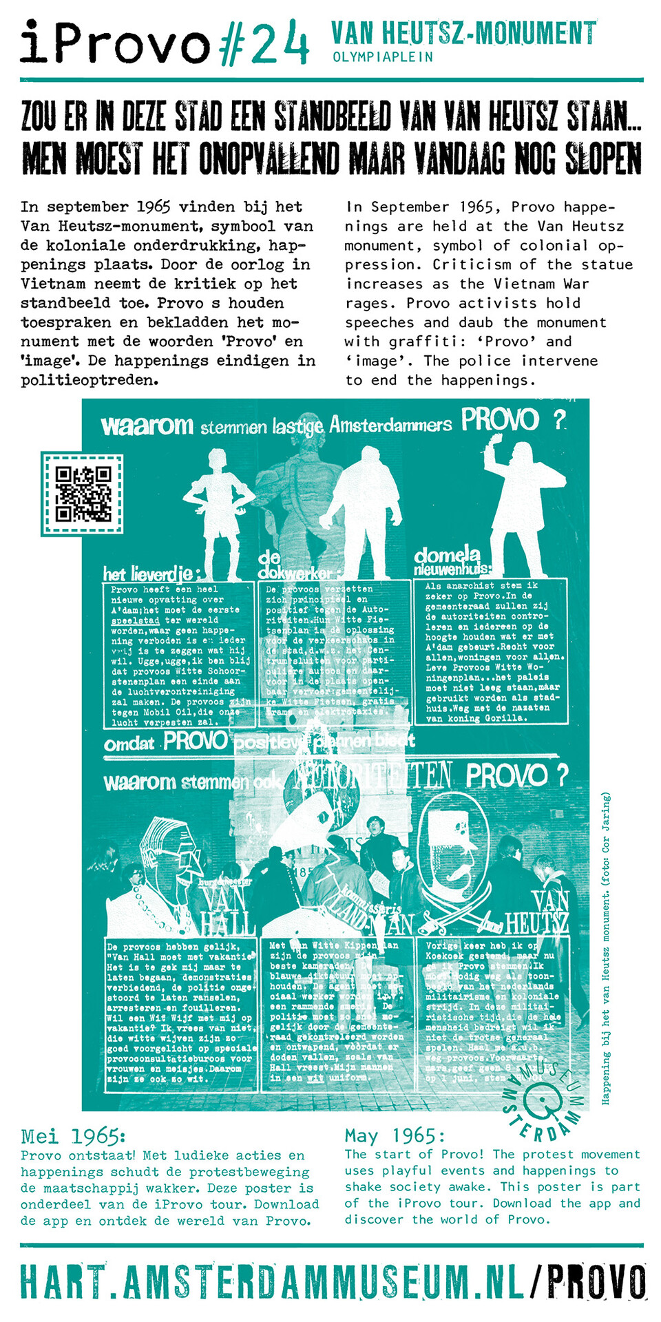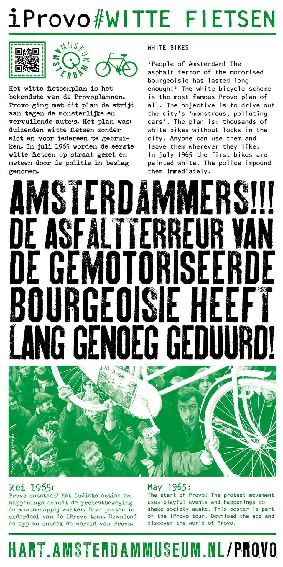 Celebrating the 50th anniversary of Provo the Amsterdam Museum made a bike tour through Amsterdam with 30 essential spots to learn more about the Provo movement. These posters were the tangible pieces and marks of the tour and with the QR code on the poster you were able to receive more information via the iProvo app.
