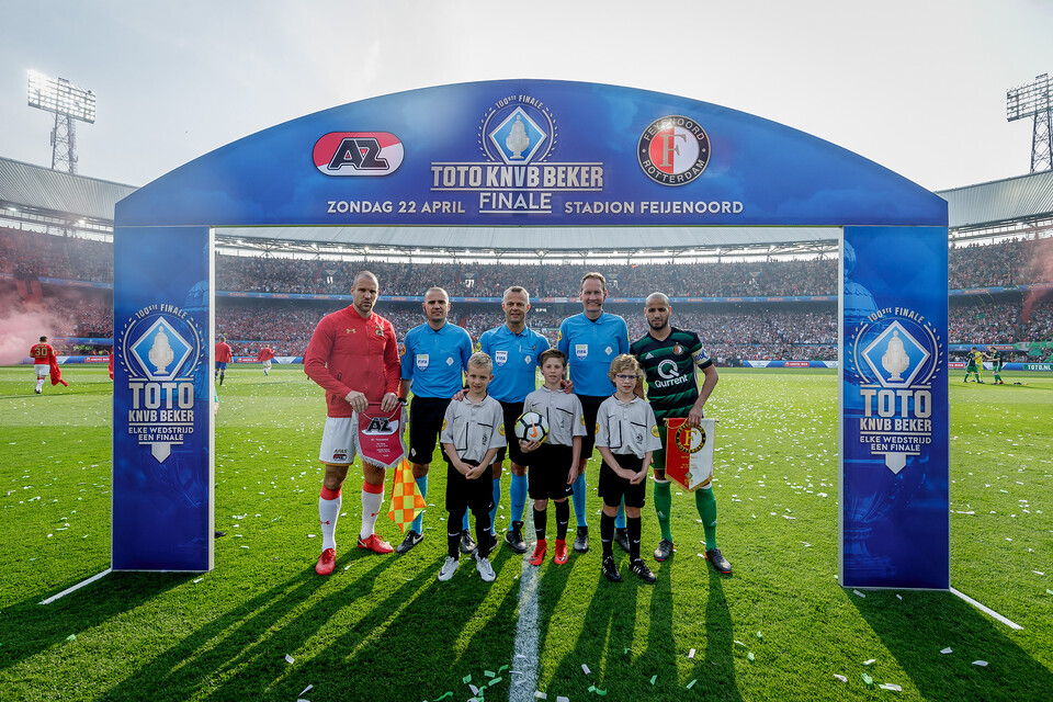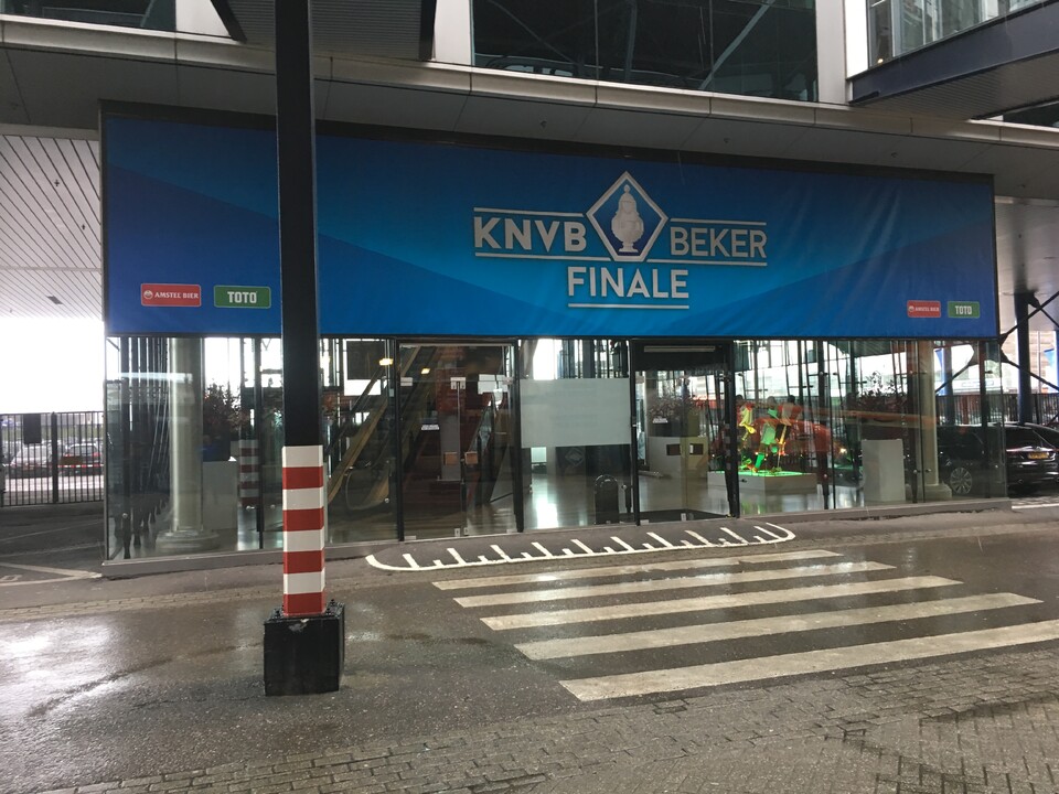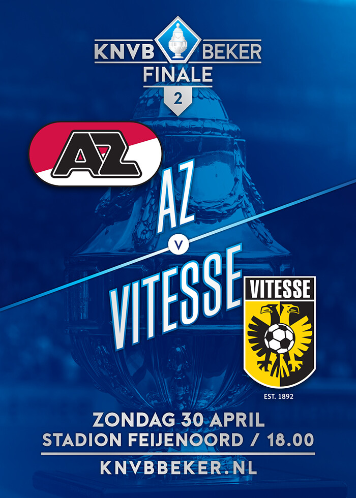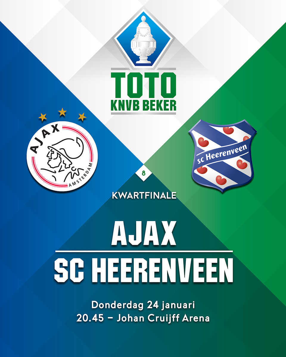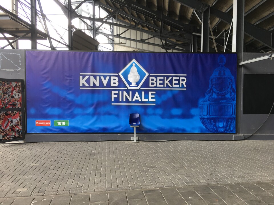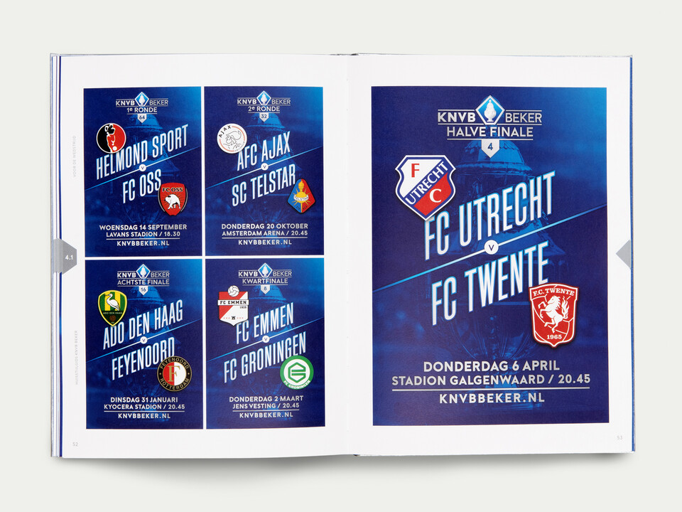 The design lasted for one season as in 2018 a new sponsor was added to the name. During the 100 years jubilee season 2017-2018 another identity was introduced as the tournament was called the TOTO KNVB Beker. The anniversary was celebrated with a golden cup. We changed all the backdrops and introduced a pattern print to the design. This all meant that the project lasted for two years before the final identity was up and running. Starting off with the clean blue and silver, transferring into the TOTO initiation of green into the design, continuing with a golden cup during the anniversary and finally working with a somewhat compromising blue, silver, green at this point.