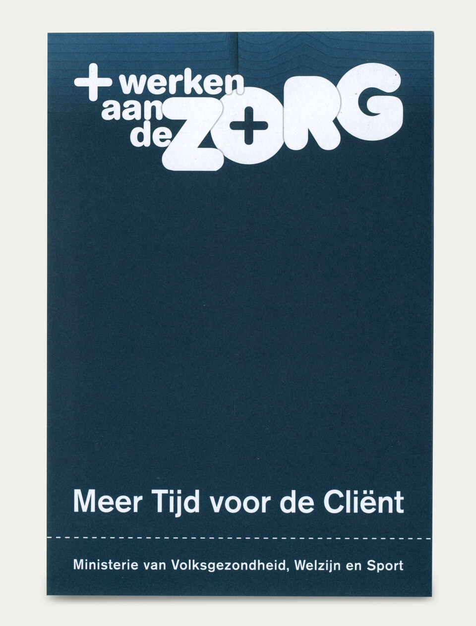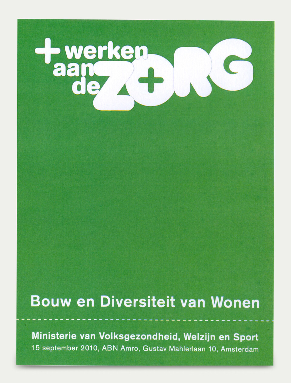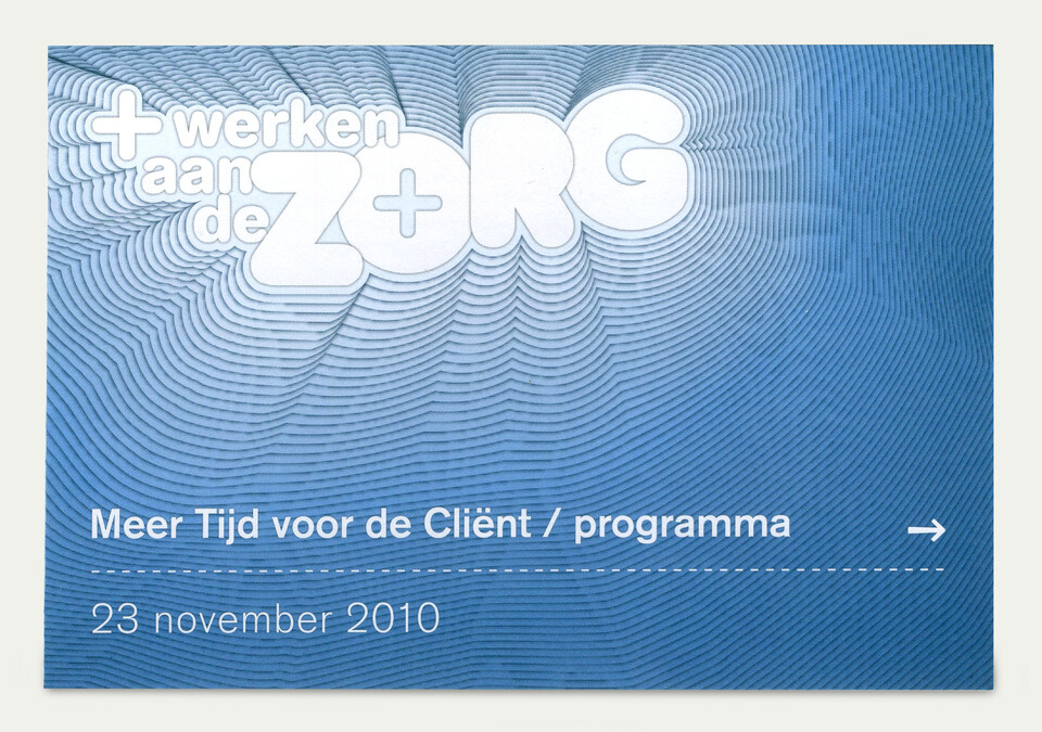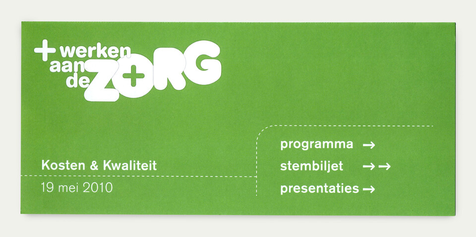 The BKB campaign agency organized several thematic events to create awareness for the changing climate in the Dutch Healthcare sector. These series of events needed an identity and a title called 'Working on (or to work on) Healthcare', Werken aan de Zorg. The events were a more attractive transmission of rather dull research and reports on the state of healthcare in word and print. The summary of more formal reports were handed out during the events and we created a 'Hero of Health' competition. It was quite a successful manner to get the message across.