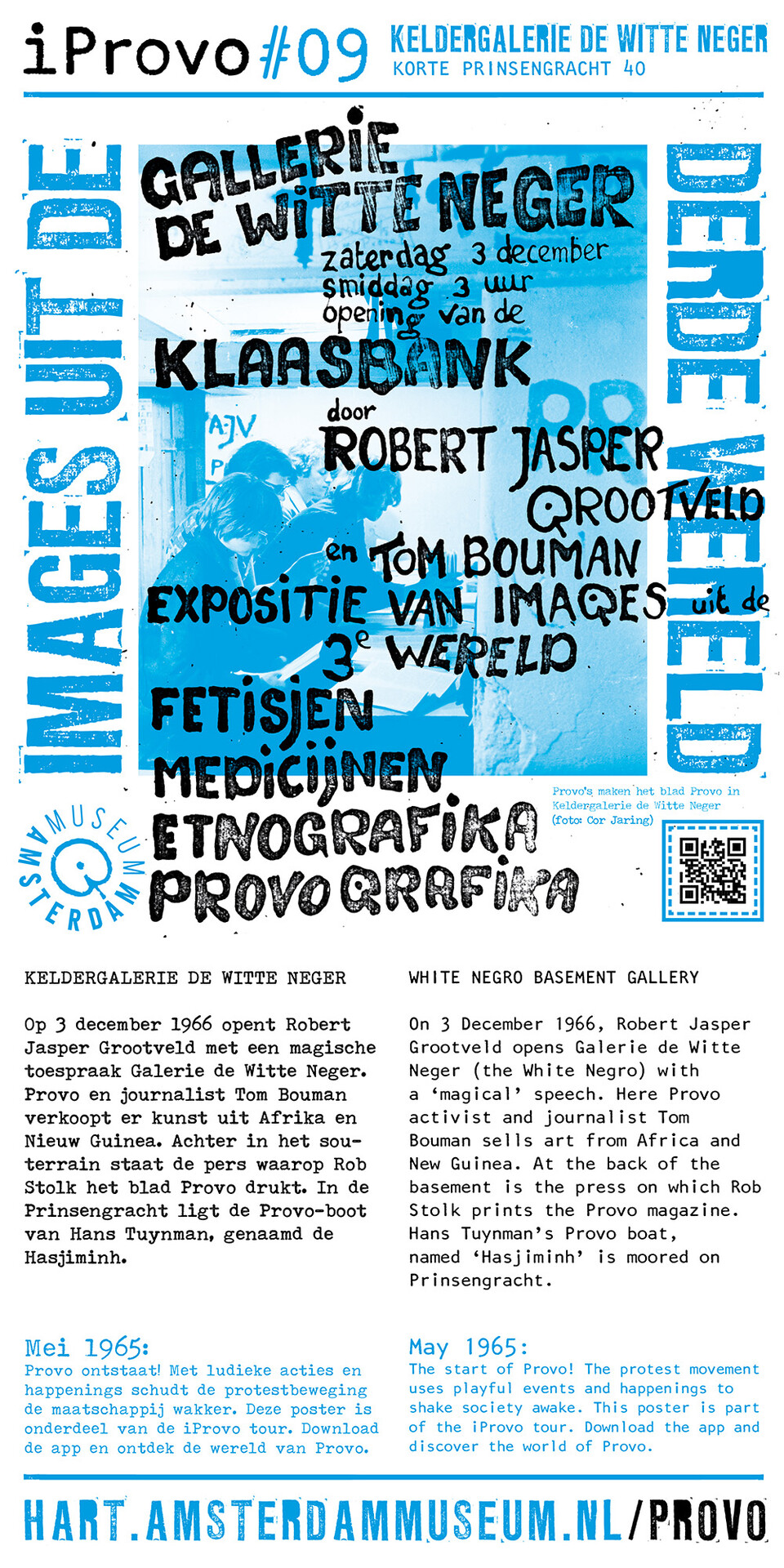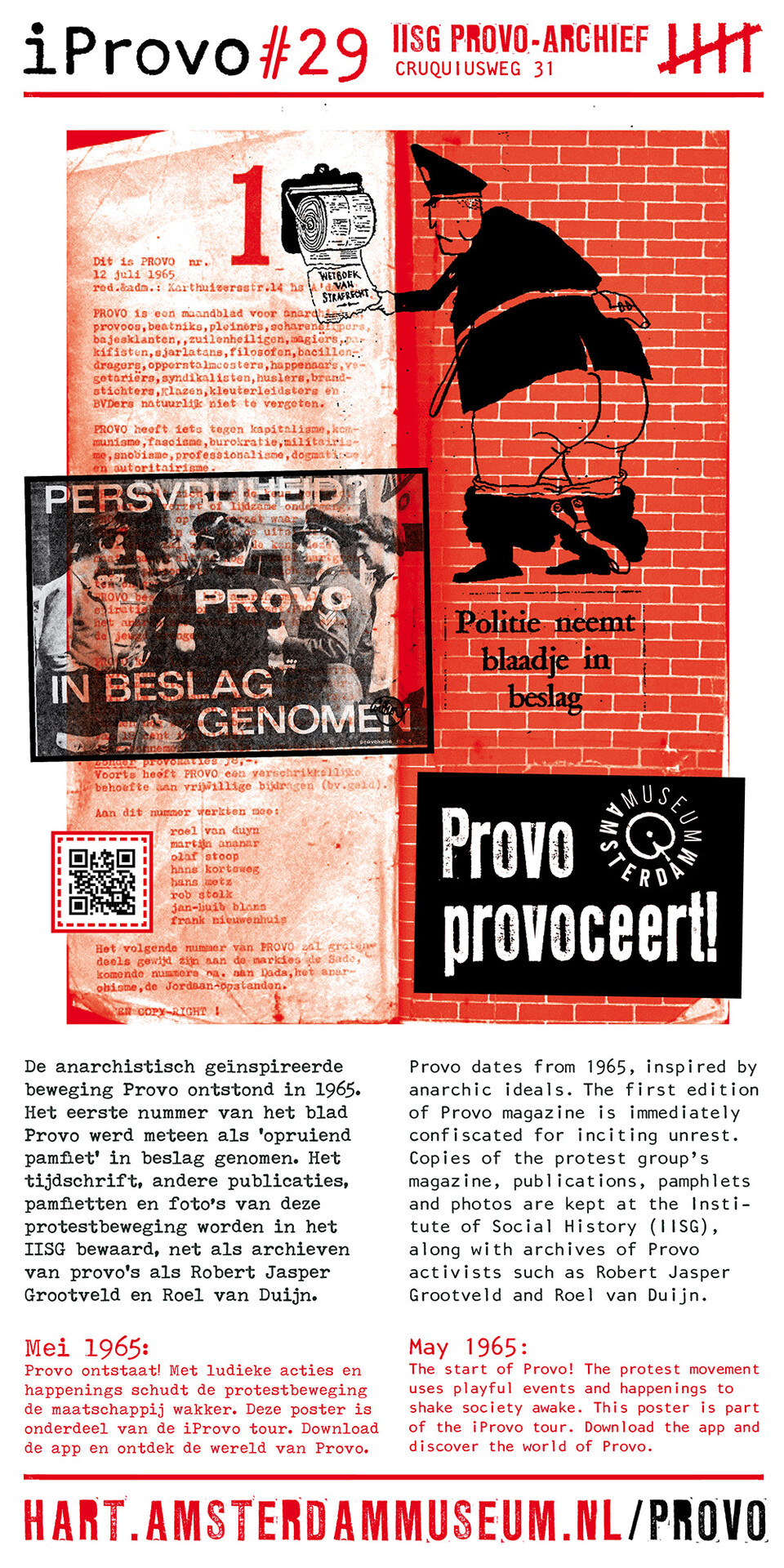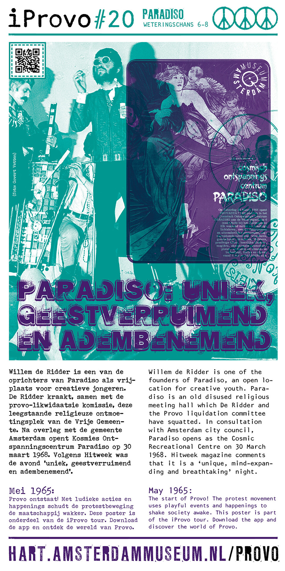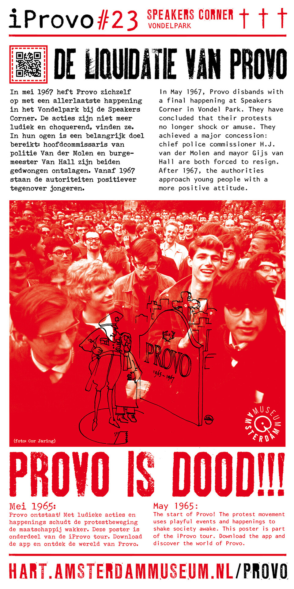 Celebrating the 50th anniversary of Provo the Amsterdam Museum made a bike tour through Amsterdam with 30 essential spots to learn more about the Provo movement. These posters were the tangible pieces and marks of the tour and with the QR code on the poster you were able to receive more information via the iProvo app.