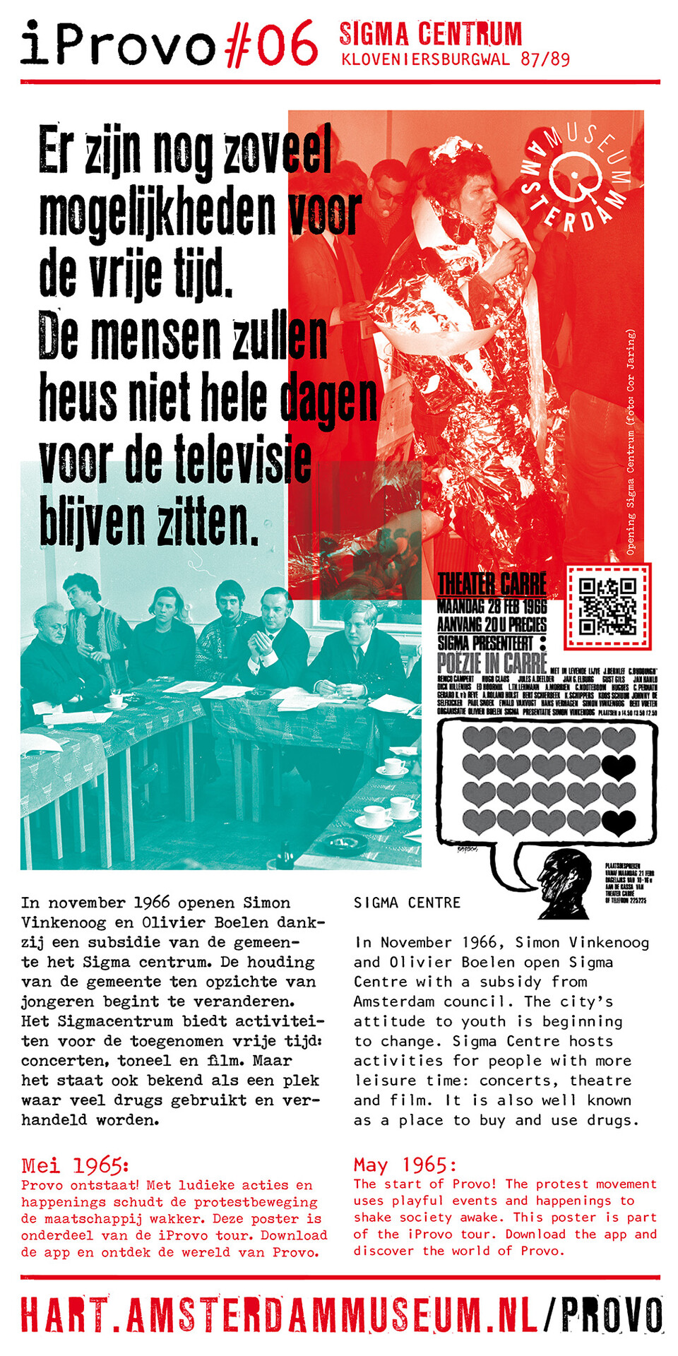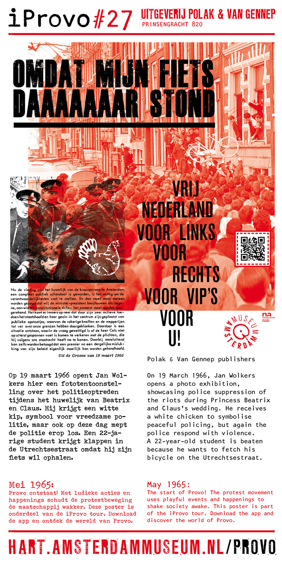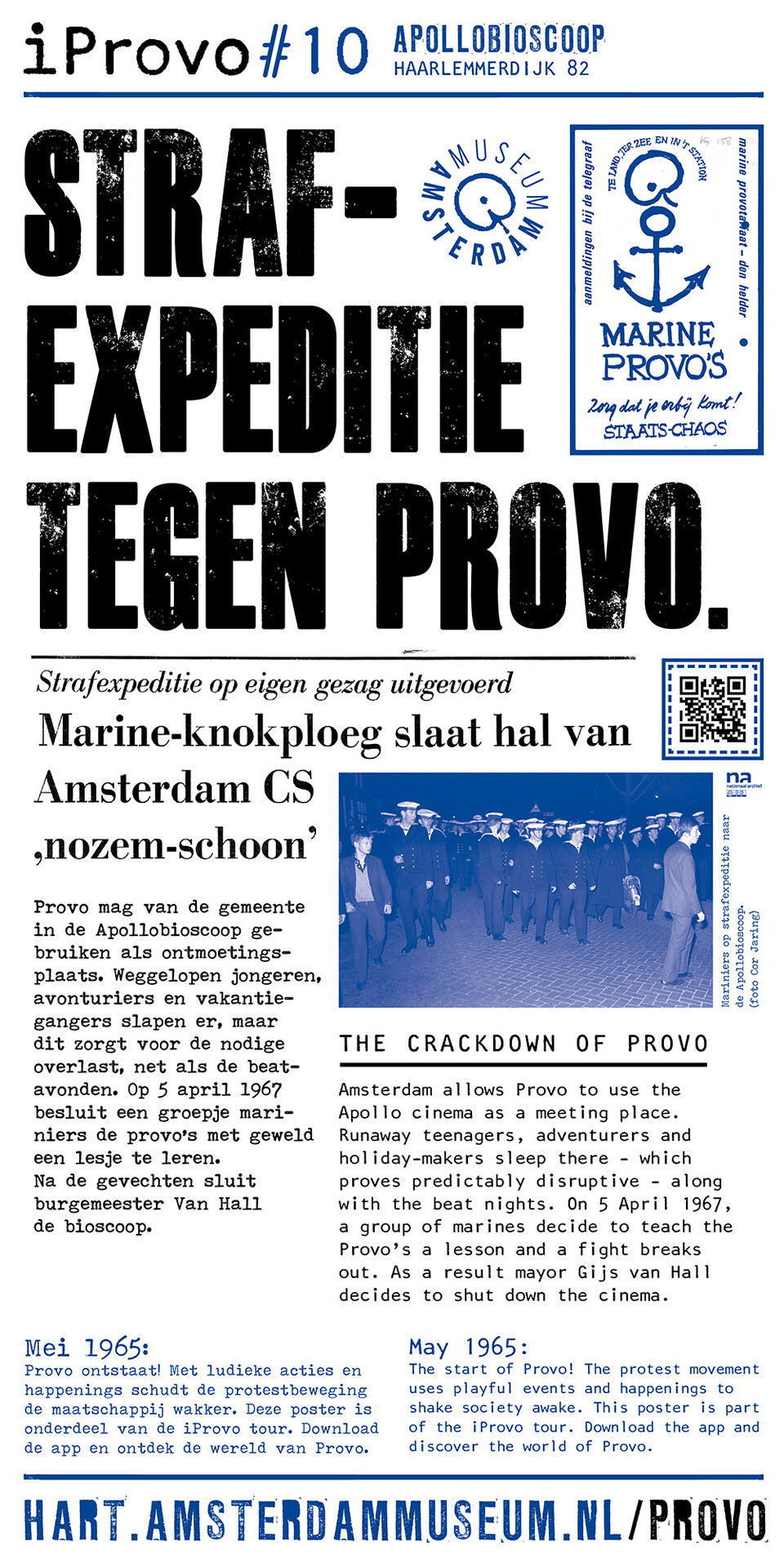 Celebrating the 50th anniversary of Provo the Amsterdam Museum made a bike tour through Amsterdam with 30 essential spots to learn more about the Provo movement. These posters were the tangible pieces and marks of the tour and with the QR code on the poster you were able to receive more information via the iProvo app.
