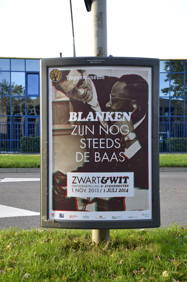We used two overlaying screens: a green and red to create a fake ‘black’, in reality a sepia, the color of most images shown from the archive. The green red and black stand for the Black Independent colors as well. The 3 quotes are part of the 10 quotes used in the exhibition’s discussion around being ‘black’ or ‘white’. A fourth poster about Black Piet was censored. Isn’t that ironic?